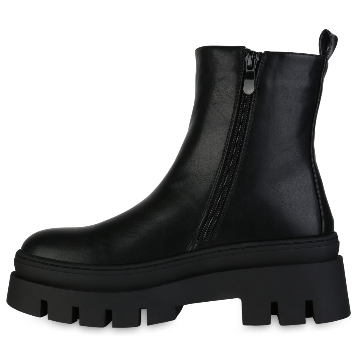 Die Plateau Boots sind ein wahrer Blickfang und liegen absolut im Trend. Das Außenmaterial besteht aus glatten Kunstleder und elastischem Textilstoff. Der Blockabsatz hat eine Höhe von 6 cm, die vordere Plateausohle punktet in 3,5 cm Höhe. Auf der Innenseite befindet sich ein Reißverschluss, der das An- sowie das Ausziehen super einfach macht. Kombiniert mit Jeans und Oberteil ist man für spontane Treffen mit den Mädels perfekt angezogen.