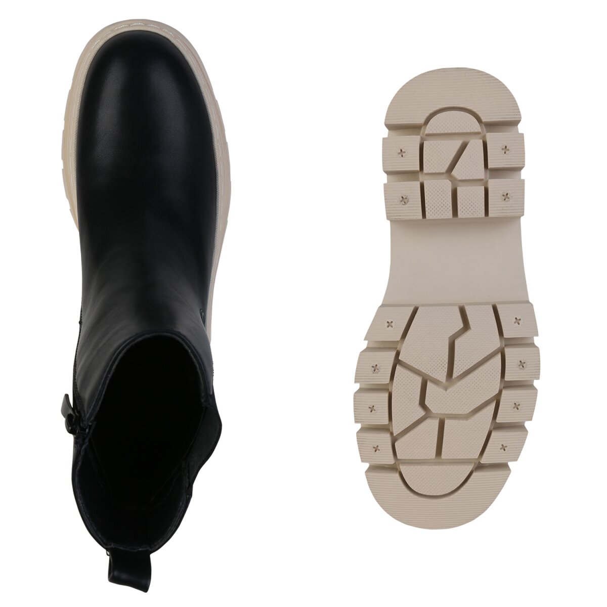 Die Plateau Boots sind ein wahrer Blickfang und liegen absolut im Trend. Das Außenmaterial besteht aus glatten Kunstleder und elastischem Textilstoff. Der Blockabsatz hat eine Höhe von 6 cm, die vordere Plateausohle punktet in 3,5 cm Höhe. Auf der Innenseite befindet sich ein Reißverschluss, der das An- sowie das Ausziehen super einfach macht. Kombiniert mit Jeans und Oberteil ist man für spontane Treffen mit den Mädels perfekt angezogen.