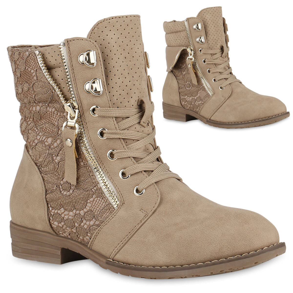 Die Schnürstiefeletten liegen im Trend und erobern die Herzen im Sturm. Die feine Blumengestaltung aus Spitze wirken besonders feminin und geben den Booties einen einzigartigen Look. Desweiteren ist ein dekorativer Zipper zu sehen, der ein zusätzliches Highlight ist. Letzendlich besitzen die Schnürer einen 3 cm hohen Blockabsatz und lassen sich angenehm tragen. Mit diesen Schnürschuhen setzt man jedes Outfit gekonnt in Szene.
